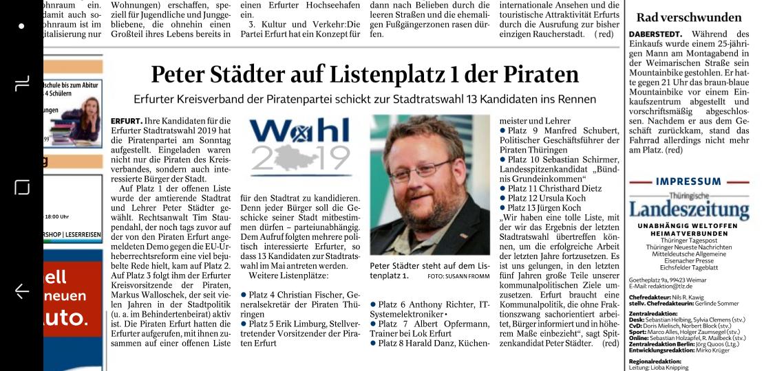 • Auf Platz 01 der offenen Liste wurde der amtierende Stadtrat und Lehrer Peter Städter gewählt. Rechtsanwalt Tim Staupendahl, der noch tags zuvor auf der von den PIRATEN Erfurt angemeldeten Demo gegen die EU-Urheberrechtsreform eine viel bejubelte Rede hielt, kam auf Platz 02. Auf Platz 03 folgt ihm der Erfurter Kreisvorsitzende der PIRATEN Markus Walloschek, der bereits seit vielen Jahren in der Stadtpolitik (u. a. im Behindertenbeirat) aktiv ist.