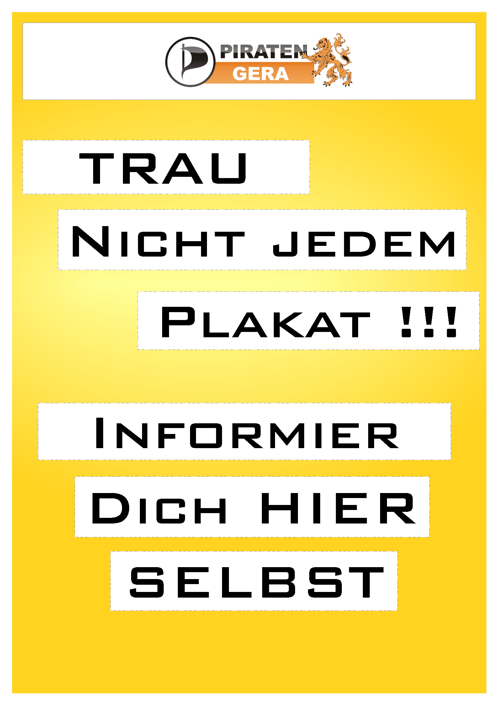 | 12:42, 16. Mär. 2012 | KV Gera 2012 Plakat TrauNichtJedemPlakat.png (Datei) | 368 KB | 1 | ||